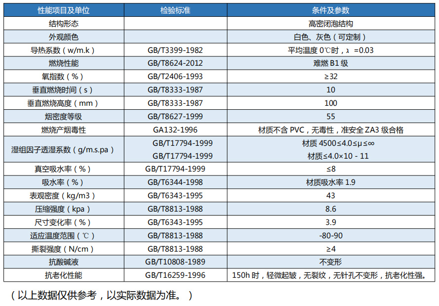主要以聚乙烯為主要原料,配合阻燃劑、發泡劑、促進劑等助劑,經密煉、開煉、擠出、發泡、冷卻、切裁而成,具有細微的獨立閉孔結構,保溫性能好、壓縮回彈性佳、抗水汽滲透能力強。