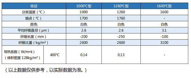 密度:96-160kg/m3;導熱系數:0.06-0.3;使用溫度:1000-1600°C。